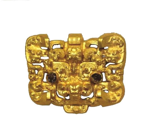 備受關(guān)注的戰(zhàn)國晚期高浮雕獸面紋金帶扣,現(xiàn)藏于甘肅省文物考古研究所。金帶扣的主體為一獸頭,采用高浮雕手法雕出;獸頭上鏤雕出龍獸相斗的圖案,并裝飾有連珠紋、卷云紋、羽狀紋等;獸頭的眼部鑲嵌藍色玻璃珠。此器物具有中原華夏與邊陲戎狄兩種藝術(shù)風格。