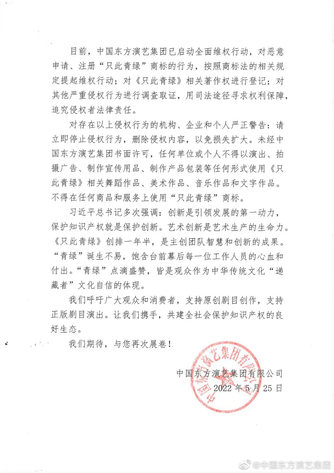 未經(jīng)中國東方演藝集團書面許可,任何單位或個人不得以演出、拍攝廣告、制作宣傳用品、制作產(chǎn)品包裝等任何形式使用《只此青綠》相關舞蹈作品、美術作品、音樂作品和文字作品。不得在任何商品和服務上使用“只此青綠”商標。