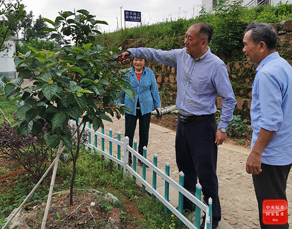 圖為江西省紀委監(jiān)委駐村工作隊員正在與村民交流果樹種植技術。