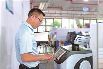 福建省福州市,服務機器人應用技術員謝茂皇正在對機器人產品的功能進行調試。周磊 攝