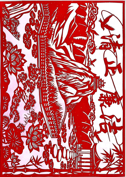 “清正廉潔”剪紙作品以西和縣晚霞湖的荷塘為背景,借荷花“出淤泥而不染”的形象比喻清正廉潔。