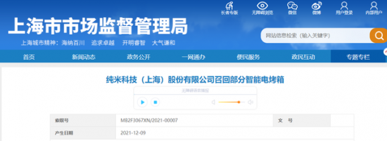據上海市市場監(jiān)督管理局網站2021年12月9日消息,純米科技(上海)股份有限公司召回部分智能電烤箱。