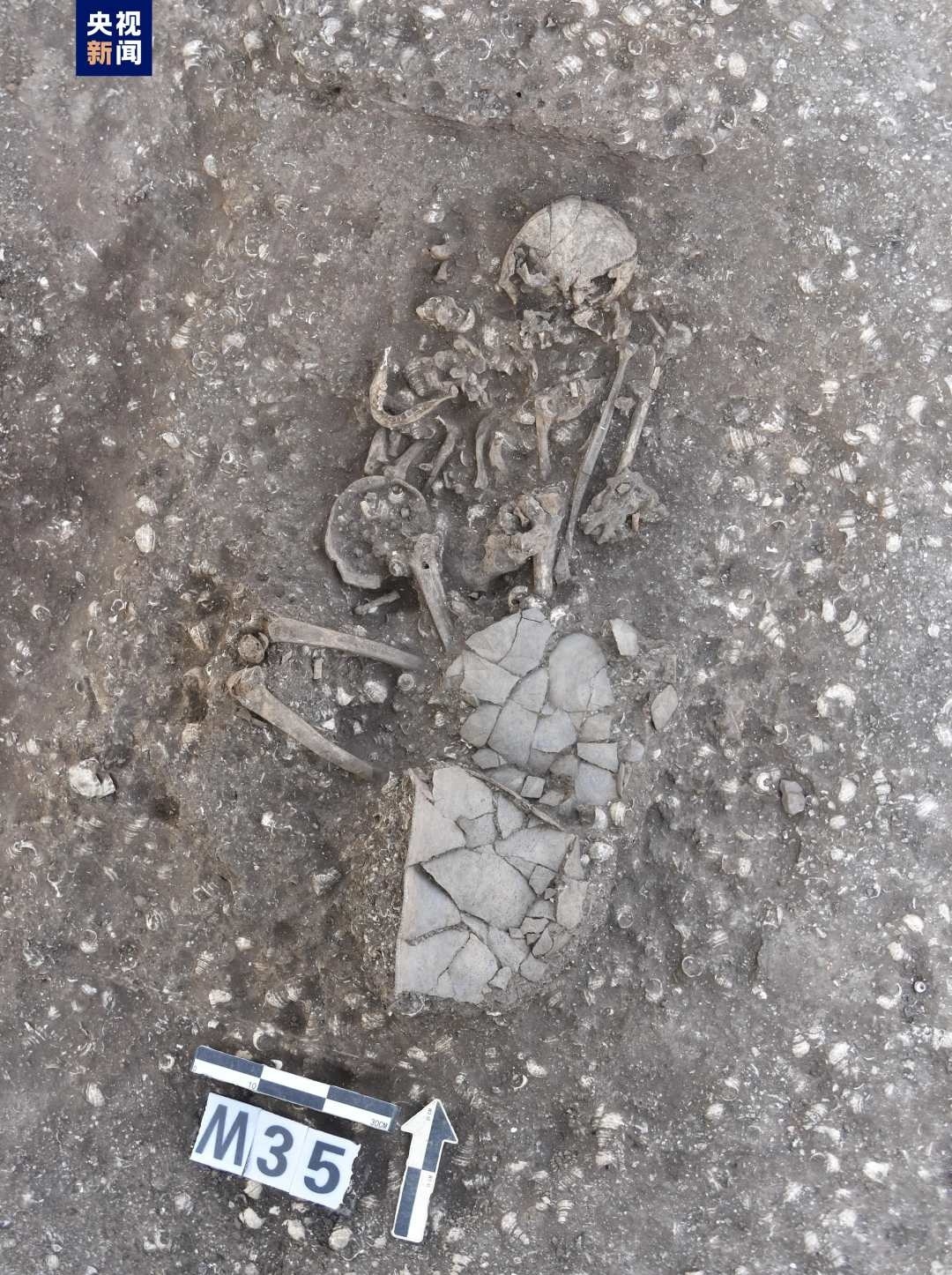 古城村遺址面積約4.2萬(wàn)平方米,現(xiàn)存的貝丘堆積最厚處達(dá)6.5米,由大量尾部被敲破的螺螄殼與灰土層交替堆疊形成。碳十四測(cè)定年代為距今3600至2500年,約相當(dāng)于中原地區(qū)的商代至兩周時(shí)期。商代遺存可分為早晚兩段,早段發(fā)現(xiàn)保存完整的橢圓形環(huán)壕聚落,由中心臺(tái)地、外圍環(huán)壕和護(hù)坡組成,中心臺(tái)地面積約27000平方米,環(huán)壕和護(hù)坡周長(zhǎng)約600米,這種聚落格局一直延續(xù)至兩周時(shí)期。商代晚段發(fā)現(xiàn)一批土坑墓和甕棺葬。兩周時(shí)期的遺存以房址、螺殼堆、灰燼、活動(dòng)面等居住類(lèi)遺跡為主,房址多為方形半地穴式。出土青銅器、陶器、玉器、石器、骨器、木器等文物4000余件。