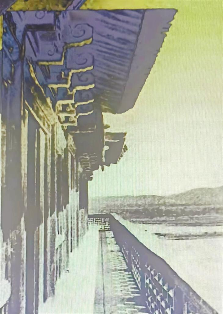林競(jìng)《西北叢編》一書(shū)載,其與蘭州友人于1919年2月7日出游雷壇河臥橋,“橋長(zhǎng)十余丈,其形如弓,橋上蓋屋,足蔽風(fēng)雨,五彩繪畫(huà),兩端有坊,東曰‘空中鰲背’,西曰‘天上慈航’,橋底無(wú)墩,自遠(yuǎn)望之,宛如臥龍。”林競(jìng)還詳細(xì)記錄了蘭州雷壇河臥橋的建造方法,并對(duì)之科學(xué)性表示肯定:“聞此橋原來(lái)有墩,因某年山洪爆發(fā),被其沖毀,自是始改今式。其法,先將兩岸之橋基筑好,以數(shù)丈長(zhǎng)之巨木直列成排,復(fù)以橫木連之,木材之?dāng)?shù),依橋之寬狹而定,其前端伸出橋中約二三尺,其后端即以巨石壓之,如是疊架不已,每加一層,即前端伸過(guò)下層數(shù)尺,如倒掛之階梯然。而層與層之間,復(fù)聯(lián)以鐵環(huán)及釘木,迨兩岸相距不遠(yuǎn)時(shí),即以巨木渡之。此種構(gòu)造,在西北往往因河水湍急,不能筑墩,或游牧之民,不知在河中建筑橋墩之法而始用之。然亦甚合於力學(xué)原理,未可忽視也。”