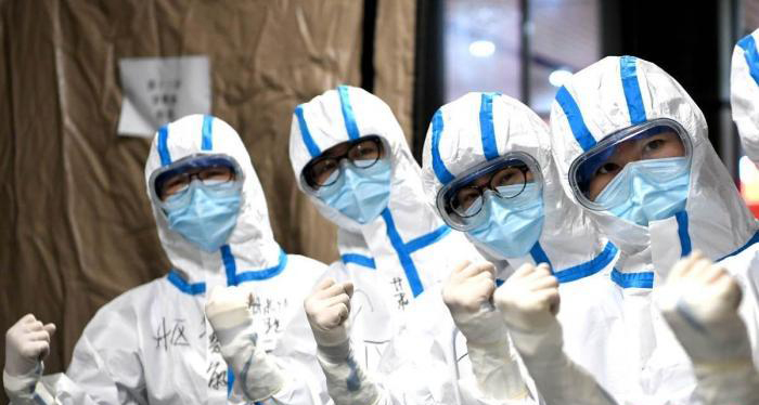 圖為武漢醫(yī)護(hù)人員在進(jìn)入病區(qū)前加油鼓勁 安源 攝