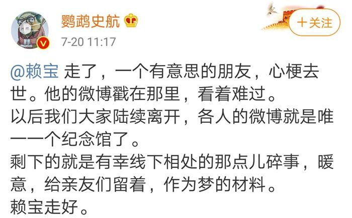 “以后我們大家陸續(xù)離開,各人的微博就是唯一一個(gè)紀(jì)念館了。剩下的就是有幸線下相處的那點(diǎn)兒碎事,暖意,給親友們留著,作為夢的材料。賴寶走好。”史航寫道。?