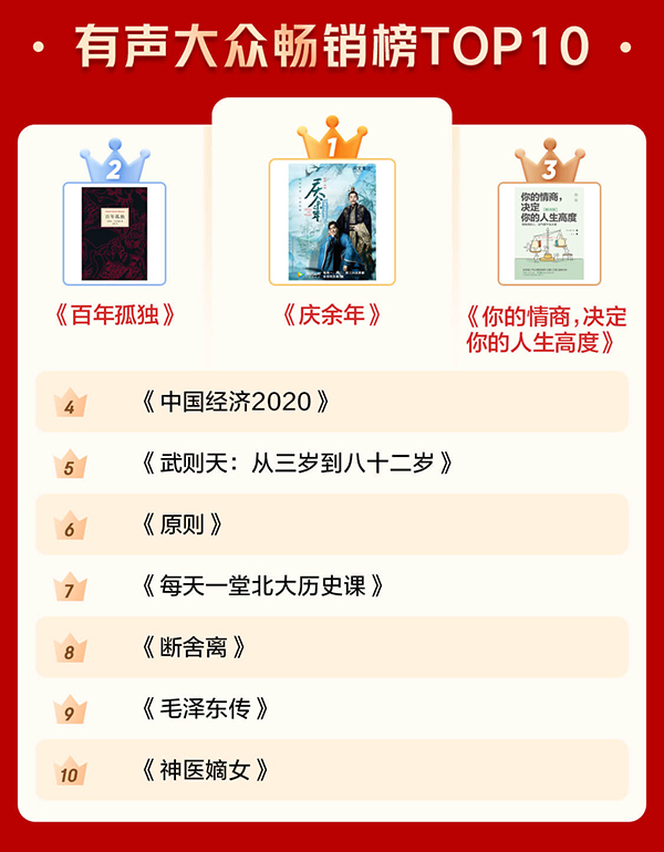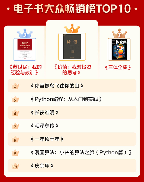通過電子書暢銷榜TOP10和有聲暢銷榜TOP10可以看出,很多人愈發(fā)關(guān)注投資和管理等方面的內(nèi)容,也愈發(fā)注重個人學(xué)習(xí)?!秲r值:我對投資的思考》《蘇世民:我的經(jīng)驗(yàn)與教訓(xùn)》 分別位居電子書暢銷榜第一名和第二名。《中國經(jīng)濟(jì)2020》《原則》進(jìn)入有聲暢銷榜前十。此外,學(xué)習(xí)類圖書《Python編程:從入門到實(shí)踐》《漫畫算法:小灰的算法之旅(Python篇)》也上榜電子書暢銷榜前十。