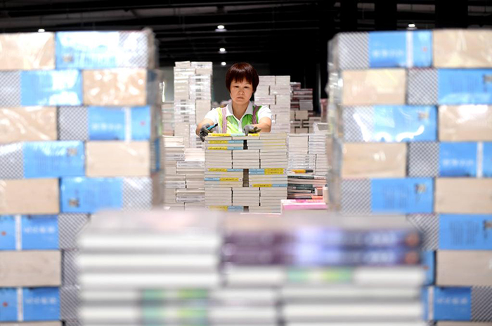 7月2日,在永清縣三圣口鄉(xiāng)一家圖書文化企業(yè)倉儲(chǔ)中心,工作人員在整理圖書。