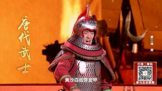 “王于興師,修我甲兵,與子偕行”是統(tǒng)一六國的秦代武士;“戎馬鳴兮金鼓震,壯士激兮忘身命”是平定邊患的漢代武士;“黃沙百戰(zhàn)穿金甲,不破樓蘭終不還”是萬里長征的唐代武士;“壯志饑餐胡虜肉,笑談渴飲匈奴血”是直搗黃龍的宋代武士。這幾位武士代表堪稱《中國詩詞大會》“史上最強出題天團”,為選手們帶來超燃的題目。