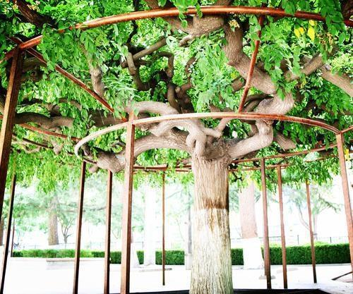 博物館里的這兩棵龍爪槐分別種植在展覽大樓前的東西兩角,是博物館的老專家郭維屏先生所種植。1959年秋冬,甘肅省博物館從通渭路舊館搬遷到七里河的新館,新館內(nèi)一片荒涼,亟待綠化。而就在此時,郭維屏老先生調(diào)入博物館工作,參與到館內(nèi)的綠植規(guī)劃建設,也正好發(fā)揮自己的藝術特長。這兩棵龍爪槐的幼株是郭老先生從五泉山苗圃選購的,栽種到展覽大樓前院的東西兩角,槐樹的周圍還設計了幾個形狀不一的花壇,花壇內(nèi)種植了各色各樣的樹木,一眼望去郁郁蔥蔥,生機盎然,頗有些韻味。這兩棵龍爪槐剛栽種時體型嬌小,看起來很不起眼。經(jīng)過郭老先生和博物館幾代人的悉心栽培,如今已是樹冠優(yōu)美,花香四溢。每到槐花盛開的時候,滿庭飄香,沁人心扉,成了博物館里一道靚麗的景色,引得路人駐足欣賞。東角的龍爪槐高約2米,樹干粗達2尺多,樹冠如傘,頂端長出八、九個主枝向四面伸展,屈曲盤繞,而后又分為數(shù)十個中枝和數(shù)百個小枝,互相攀援,屈折如爪,一枝獨秀。而西角的龍爪槐因基建的原因長勢受到一定影響。